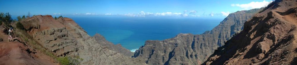 Wir sind nicht nur am Strand rumgelungert, sondern haben auch einige Gewaltmärsche unternommen, die uns ganz schön geschlaucht haben. Und, glaubt mir, mein Leben war nicht arm an brutalen Märschen. Der so genannte "Alakai Swamp Trail" ist 15 Kilometer lang und man muss einige Höhenmeter überwinden, das dauert schlappe 6 Stunden. Und einige Tage darauf ging's auf den Nualolo-Awaawapuhi-Trail, der nochmals 15 Kilometer lang war mit 2000 Fuß Höhenunterschied. Auf so einem Trail trifft man natürlich kaum Amerikaner, sondern -- natürlich -- Deutsche und ein britisches Ehepaar. Und auf dem Weg zurück zum Parkplatz, der eine Weile lang an einer Straße entlang führte, nahm uns ein Franzos' noch die letzten Meter im Auto mit. Amerikaner haben anscheinend eine Abneigung gegen Gewaltmärsche.