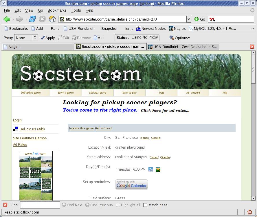 Zunächst fiel uns auf, dass erstaunlich viele Frauen mitspielen. Und das Spielniveau der Männer ist, ähm, nicht gerade Weltklasse. Aber es war sehr lustig und ich erfuhr, dass man sich heutzutage zum Gelegenheitsfußball auf dem Internet zusammenfindet: Auf der Seite http://socster.com wählt man zunächst die Region aus, dann einen der eingetragenen Plätze und schon kann man in Diskussionsforen ausmachen, wann und wieviel Leute zusammen kommen.