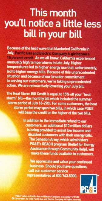 Angelika Letzte Woche flatterte unsere Stromrechnung von PG&E (=Pacific Gas and Electric Company) ins Haus und ich wunderte mich schon, warum diese deutlich niedriger als sonst war. Dann sah ich aber den beigelegten Zettel, der freundlich erklärte, dass jeder Kunde rückwirkend 15 % Rabatt mit dem schönen Namen "Heat Storm Bill Credit" für seine im Juli angefallene Gas- und Stromrechnung bekommt. Denn, so hieß es weiter, eine ungewöhnliche Hitzeperiode hätte im Juli Kalifornien in Schach gehalten und somit bei vielen Haushalten zu höherem Stromverbrauch (Stichwort: Klimaanlage) und Rechnungen geführt. Hä? Ich dachte eigentlich bisher, dass wir im Zeitalter der Erderwärmung leben und dass das Stromsparen und nicht das Stromverschleudern belohnt werden sollte. Diesem Prinzip blieb PG&E sonst eigentlich auch immer treu. Bei früheren Hitzeperioden wurden die Konsumenten angespornt, ihren Stromverbrauch zu drosseln, d.h. zum Beispiel die Kimaanlage herunterzudrehen, um bei beträchtlicher Einsparung später dann einen Preisnachlass zu bekommen.