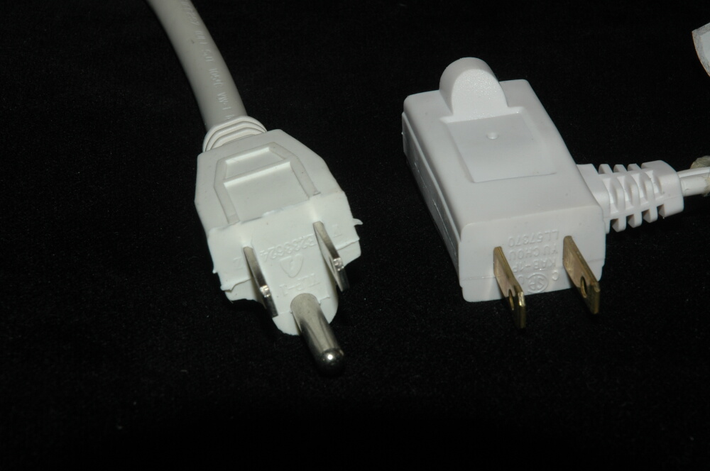 Wie bei deutschen Schukosteckern gibt es bei den nordamerikanischen Steckern dreipolige Varianten (mit runder Erdung) und solche, die nur zwei Kontakte aufweisen. Superlästig ist das, wenn zum Beipiel das amerikanische Laptopnetzteil einen dreipoligen Stecker hat aber die Steckdose im Hotel nur zwei Pole bereitstellt, was durchaus vorkommt. Für solche Fälle habe ich einen wahrscheinlich illegalen neongrünen Adapter von einem zurückliegenden Japanurlaub (Japan hat die gleichen Steckdosen), der aus drei Polen zwei macht.