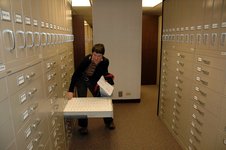 Will man eine Kopie eines gerade betrachteten Bildes ziehen, nimmt man den Mikrofilm mit beiden Spulen aus der Maschine und stellt sicher, dass das gerade betrachtete Bild aufgeschlagen bleibt. Dann trägt man ihn rüber zum Kopierraum, legt ihn in eine Kopiermaschine, und zahlt 23 Cents für eine Papierkopie.