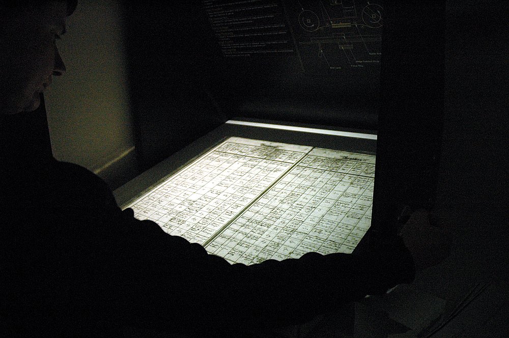 Den Mikrofilm holt man sich eigenhändig und ohne Aufsicht aus der Schublade. Er sieht aus wie eine dicke aufgewickelte Filmspule von etwa 10cm Durchmesser, etwa so breit wie ein Fotonegativ. Die Rolle legt man dann in ein mannshohes Gerät ein, spult den Film etwas ab und führt das lose Ende durch eine gläserne Projektionsplatte in eine Auffangspule auf der anderen Seite. Mit einer Kurbel an der Seite des Apparats dreht man dann, und die Einzelbilder werden von einer oben angebrachten Halogenlampe angeleuchtet und auf eine etwa 60x60cm große waagrechte Fläche projeziert. Geht man durch die Reihen, sieht man Leute, die gschaftig an den Kurbeln drehen, Einträge untersuchen und sich Notizen machen.