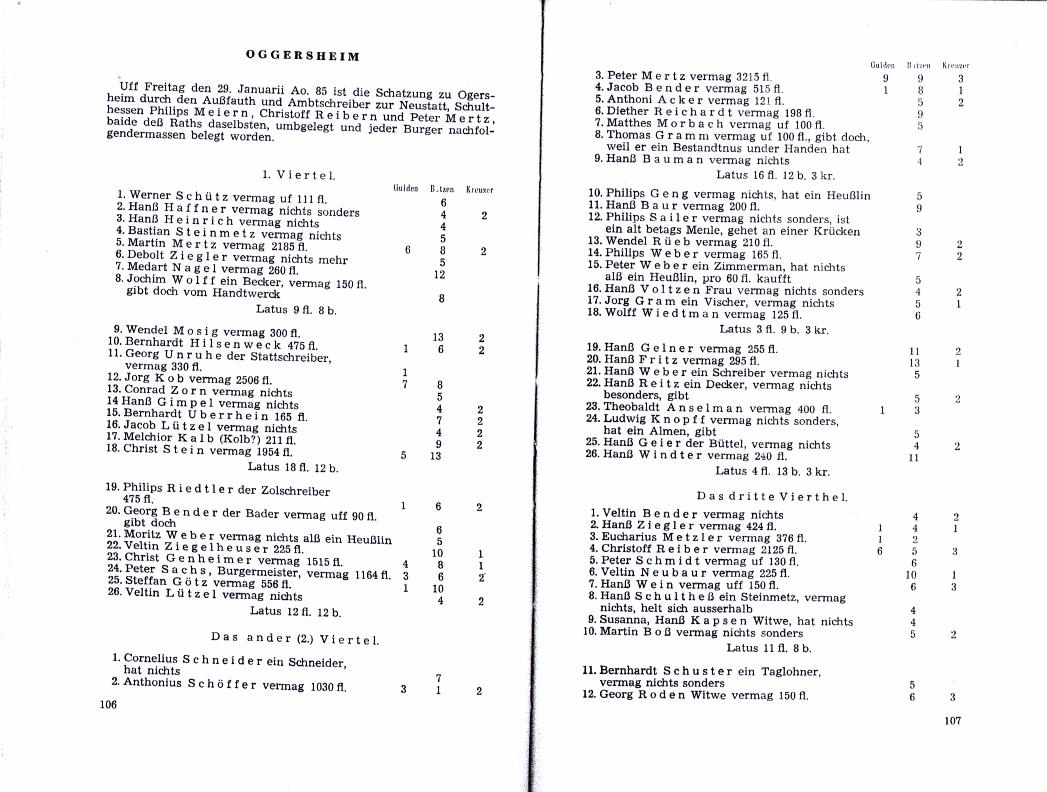 Die Bücher in der Bibliothek sind ebenfalls umwerfend. Es gibt sogar Ausgaben der alten Nazizeitschrift "Ahnenerbe - Bund für Sippen- und Wappenforschungshilfe, Erbkunde und Rassenpflege". Und was ich auch noch nicht wusste: 1529 lagen die Türken vor Wien und die Verteidigung des Abendlandes wurde im Deutschen Reich mit der sogenannten "Türkensteuer" finanziert. In der Sammlung der "Family History Library" fand ich in Buch, in dem das Türkensteuerregister von 1584 nachgedruckt steht. In Abbildung 10 seht ihr, wer wann wieviel zahlte, und falls nicht, warum. Falls ihr euch mit altertümlichen Währungen nicht auskennt: Ein Gulden (fl. = Floreniner) zählte damals 15 Batzen (b.), der Batzen wiederum 4 Kreuzer (kr.).