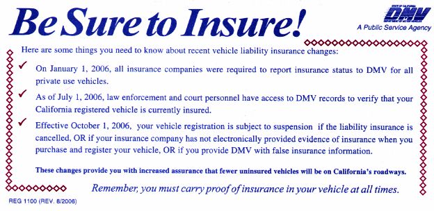 Meldet man in Kalifornien ein Auto an, muss der Autobesitzer nachweisen, dass eine Haftplicht besteht. Und jedes Jahr, wenn die KFZ- Steuern fällig sind, muss man wieder eine Bescheinigung vorlegen oder per Post einschicken. Neuerdings meldet die Versicherung den Status des Vertrags oft elektronisch an die Führerscheinstelle. Seit Oktober 2006 gilt weiter, dass die Zulassung entzogen wird, wenn die Haftpflichtversicherung aus irgendwelchen Gründen nicht mehr besteht. Andere Bundesstaaten sind da wesentlicher lascher.