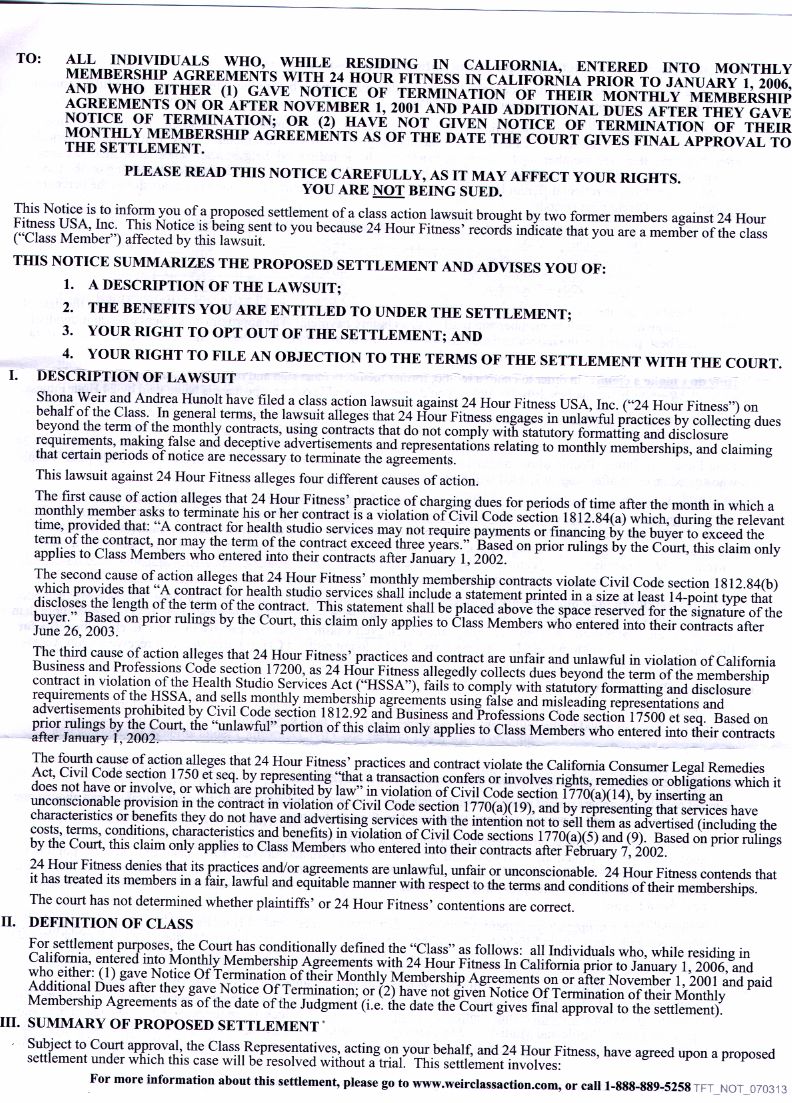 Wir wurden lediglich darüber informiert, dass sich unser Fitnesscenter "24 Hour Fitness" in unlautere Geschäftspraktiken verstrickt hatte. So hatte die Firma Kündigungen ihrer monatlich zahlenden Kunden nicht sofort bearbeitet, sondern erst einen Monat später.
