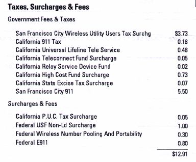 Auf den Grundbetrag kommen aber noch $3.73 "San Francisco City Wireless Utility Users Tax Surchg" hinzu, dann $0.18 "California 911 Tax" und so weiter und so fort. 12 Posten sind es insgesamt und ganze $12.91 werden so auf den Rechnungsbetrag aufgegaunert. Ruckzuck erhöht sich der monatliche Handypreis um 26%!