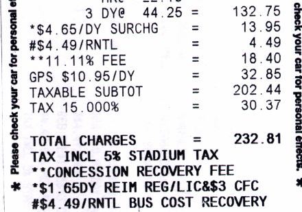 Ähnliches zeigte sich auf der Abrechnung für das Mietauto: Da es eine Dienstreise war, musste ich zu Firmenkonditionen buchen und bekam glatt ein Auto zum Mondpreis von $44.25 am Tag. Und das für einen Quatschkarren der Marke Mitsubishi Eclipse! Wenn ich privat ein Auto miete, zahle ich nie mehr als $20 pro Tag. Aber nicht genug damit, auch noch absurde Posten wie $1.65 "REIM Reg/Lic" und $3 "CFC" wurden dazugerechnet. Pro Tag!