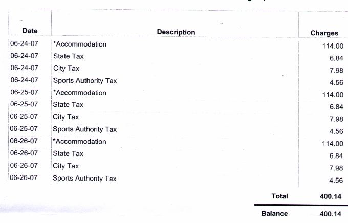 Aber nicht nur die Telefongesellschaften tricksen, auch die Hotels ergaunern immer mehr Geld von ihren Gästen über versteckte Gebühren. Neulich fuhr ich zu einer Konferenz nach Houston im Bundesstaat Texas und staunte nicht schlecht, als auf der Rechnung absurde Posten wie "Sports Authority Tax" abgeführt wurden. Das Zimmer kostete $114 am Tag. Darauf kamen $6.84 "State Tax", $7.98 "City Tax", $4.56 "Sports Authority Tax". Kein Scherz! So wurden aus $114 ruckzuck $134 am Tag (Abbildung 2).