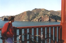 (Angelika) Unsere Golden-Gate-Bridge-Überquerung mit dem Fahrrad haben wir auch schon hinter uns. Wir haben das bei strahlendem Sonnenschein gemacht, so dass die Brücke in ihrem schönsten Rot leuchtete. Damit wir nicht zu viele Hügel und gefährliche Straßen passieren mussten (das ist nichts für mich), haben wir unsere Fahrräder zunächst in die Bart (U-Bahn in San Francisco) mitgenommen und sind zum Embarcadero gefahren (wer schon mal in San Francisco war, weiß wo das ist; für die nicht Ortskundigen: Straße, die direkt am Wasser lang führt). Und dann ging es immer am Wasser entlang zur Golden Gate, den Blick immer auf die Brücke, Alcatraz und die Boote auf der Bay gerichtet.