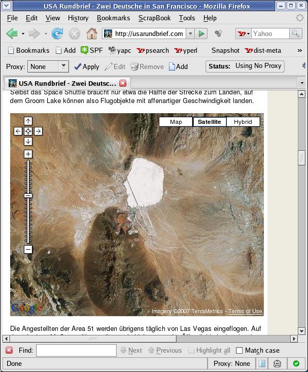 Unten seht ihr das Satellitenbild der Area 51 auf Google Maps. Der weiße Fleck ist ein riesiger eingetrockneter Salzsee, der "Groom Lake". Südlich des Salzsees befinden sich allerlei Hangars, Tanks und kasernenähnliche Gebäude. Weiter südlich ist ein hügeliges Gelände, der "S-4" genannte Sicherheitsbereich. In die Hügel sind getarnte Hangars eingebaut. Dort stehen die abgefahrensten Flugobjekte, manche Leute vermuten UFOs. Wenn ihr auf der Landkarte etwas rauszoomt, seht ihr gleich darunter einen weiteren Salzsee, den "Papoose Lake".