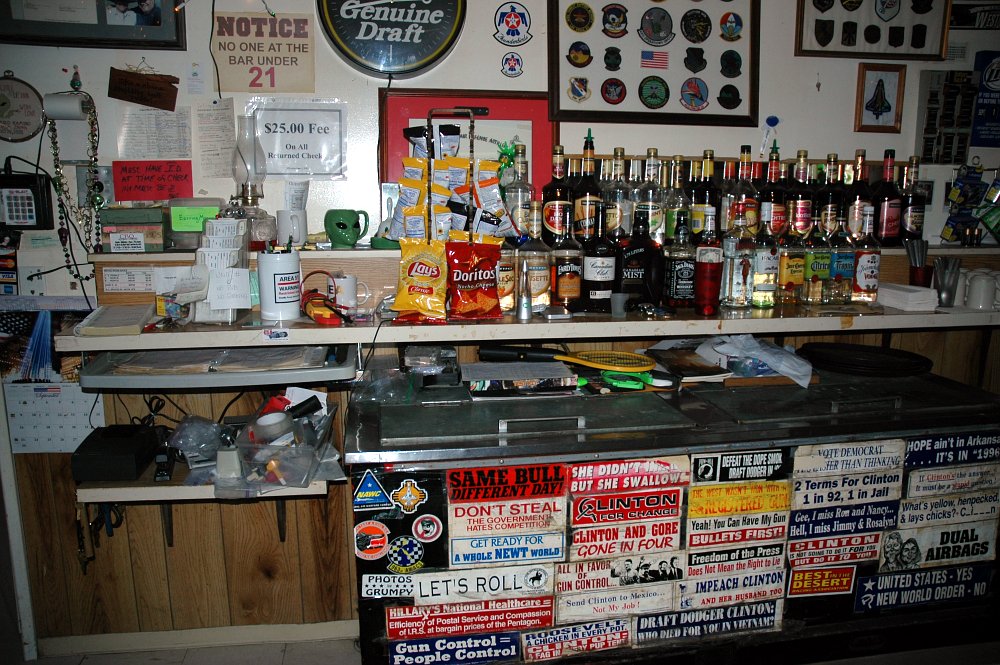 Außerdem war die gesamte Bar (Abbildung 8) mit Aufklebern mit Republikaner-Sprüchen aus der Clinton-Ära bepflastert. Beispiele: "Yeah! You can have my gun -- bullets first!" ("Ja, du kannst meine Waffe haben -- die Kugeln kriegst du zuerst!"), "Send Clinton to Mexico - not my job!" ("Schickt Clinton nach Mexiko, nicht meinen Job!"), "Hillary's National Health Service = Efficiency of Postal Service and Compassion of I.R.S. at bargain prices of the Pentagon" ("Hillary Clintons staatliche Krankenkasse = Effektiv wie die Post, mitfühlend wie das Finanzamt, und zu Schlagerpreisen wie im Verteidigungsministerium").