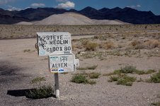 Wegen diesen vermuteten Begegnungen der zweiten Art heißt der Highway 375 in Nevada "Extraterrestrial Highway", also "Autobahn der Außerirdischen". Zwischen den Meilensteinen 34 und 35 auf dem Extraterrestrial Highway (nachfolgend ET Highway genannt) geht Richtung Südwesten die sogenannte "Groom Lake Road" ab, ein ungeteerter Feldweg. Er führt an einer Ranch vorbei, die einem gewissen Steve Medlin gehört. Dessen Mailbox, die einige Meilen südlich auf einem Feldweg steht, ist höchstwahrscheinlich der meistfotografierte Briefkasten der Welt. Vor dem 27. März 1996 war er schwarz und sah richtig unheimlich aus. Dann wurde er durch den weißen Kasten in Abbildung 3 ersetzt, der unten noch ein Extrafach aufweist, in das man Post für die Außerirdischen ablegen kann.