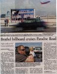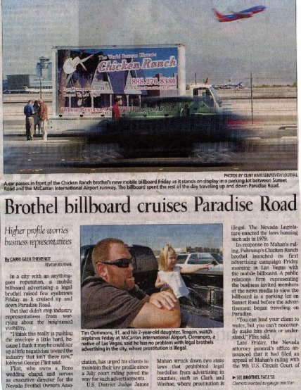Im Bundesstaat Nevada (Motto: Alles geht) gibt es allerdings einige Counties (Landkreise), die den Betrieb von Bordellen erlauben, allerdings ist die Stadt Las Vegas davon ausgenommen. Um nun die in der Stadt verweilenden, ähm, Junggesellen in diese Betriebe einzuladen, verteilen Südamerikaner zum Niedrigstlohn am Straßenrand Kärtchen mit halbbekleideten Damen und aufgedruckten Telefonnummern. Neuerdings fahren auch Lastwagen mit riesigen Leinwänden durch die Gegend, um die Freudenhäuser mit den eindeutigen Namen "Shady Lady Ranch" und "Chicken Ranch" bekannt zu machen. Laut einem Zeitungsartikel kommt das im prüden Amerika nicht gut an, aber rechtlich ist das wohl in Ordnung.