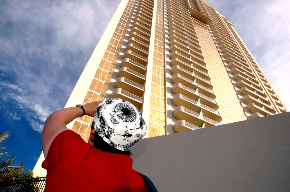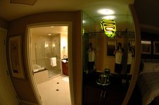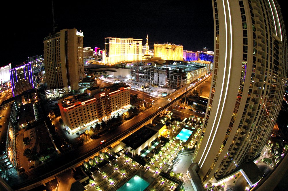 Ich bin ja relativ schwindelfrei und habe bisher nur zweimal in meinem Leben das Gefühl gehabt, dass es mir höhenbedingt den Boden unter den Füßen wegzieht: Auf Angel's Landing, dem schwindelerregenden Berggrat im Zion-Nationalpark (Rundbrief 12/2003) und auf dem offenen (!) Balkon dieser Suite im 23. Stock, etwa 80 Meter über dem Swimming Pool. Normalerweise kann man in Las Vegas nirgends auch nur ein Fenster öffnen, zu groß ist wohl die Angst der Hotelbetreiber vor Millionenklagen oder schlechter Presse. Aber im MGM Signature öffnet man einfach die Tür und steigt aus dem klimatisierten Zimmer raus auf den Balkon. Man traut sich kaum bis ganz vor ans Geländer, spürt die immer noch fast 40 Grad heiße Wüstennacht und schaudert ob der Höhe.
