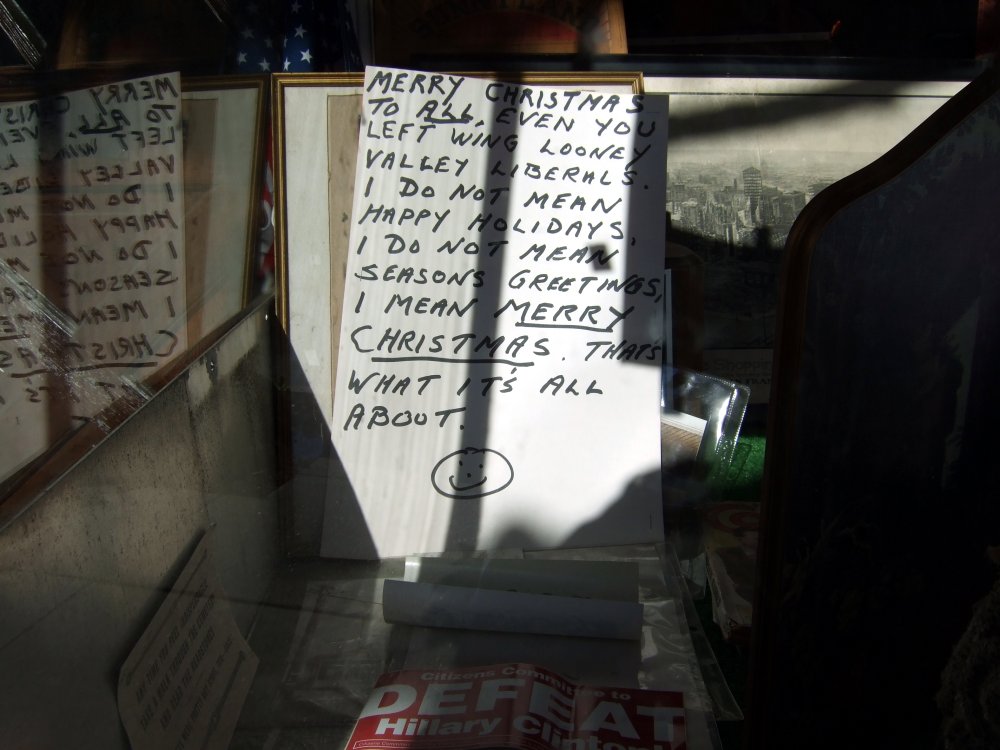 Nun hindert dies die religiöse Rechte, wie auch den schon öfter erwähnten republikanischen Immobilienhändler in unserem Viertel (Rundbrief 12/2002), nicht daran, lauthals zu protestieren, dass "Merry Christmas" aus dem Sprachschatz verschwindet und deshalb das christliche Abendland dem Untergang geweiht ist. Eine vielleicht doch etwas extreme Ansicht.