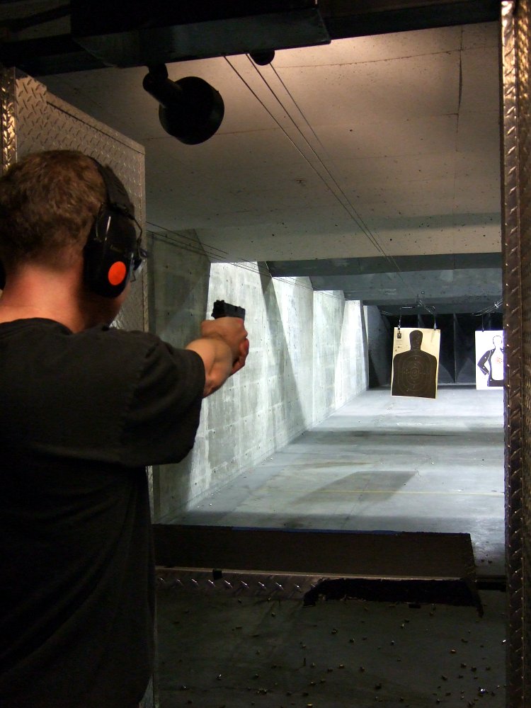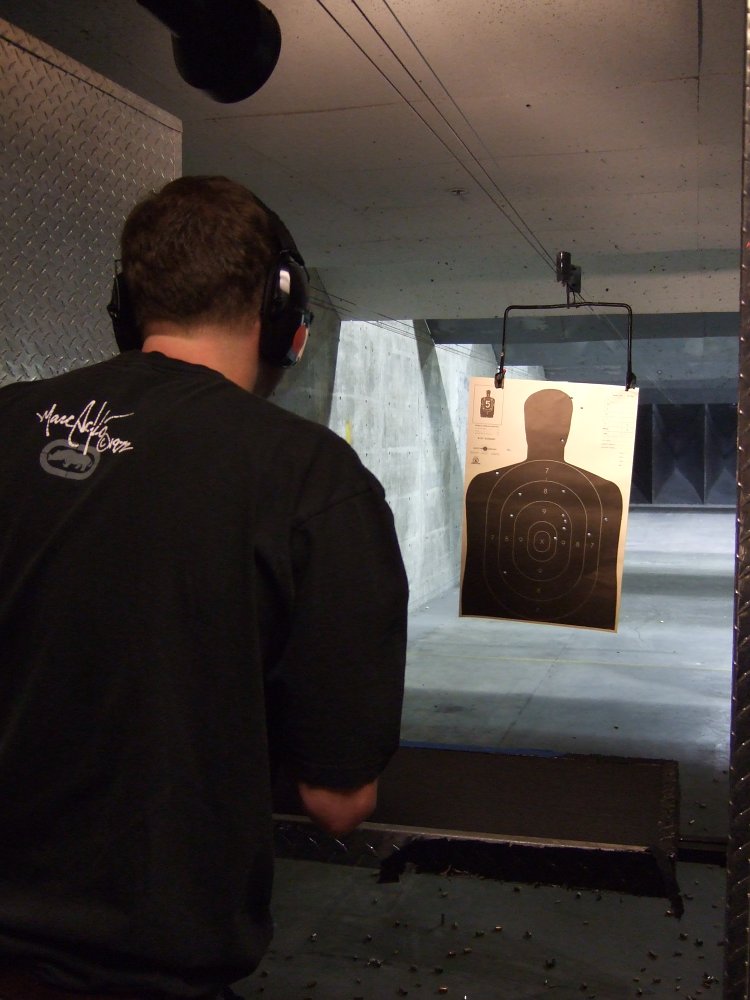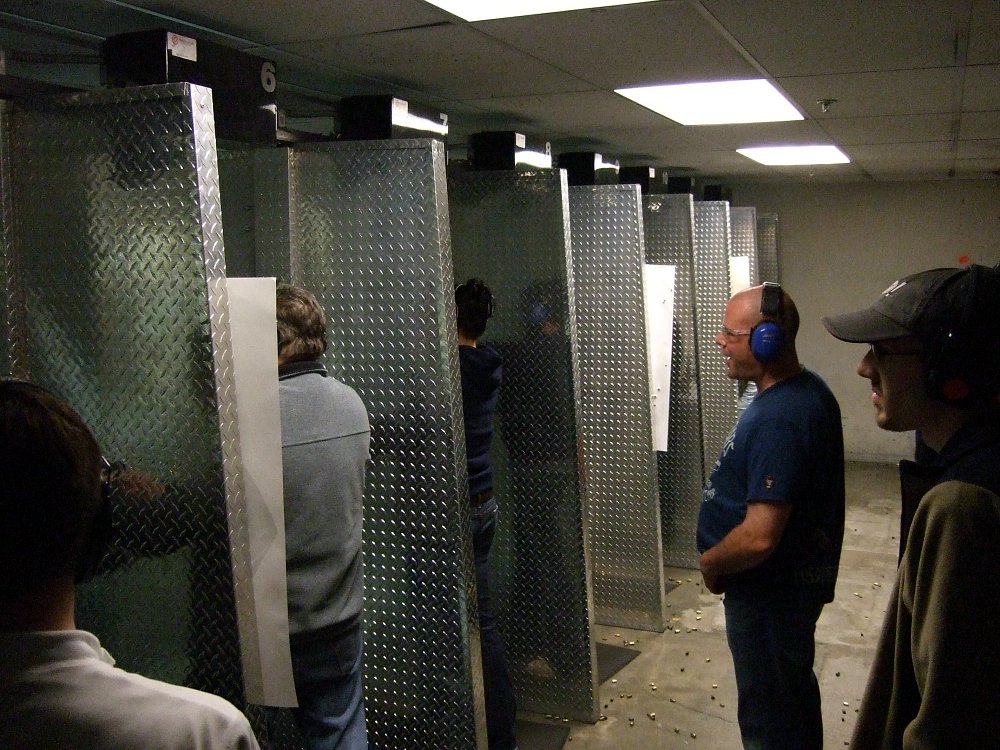 Wir hatten einen Höllenspaß, feuerten jeder so um die 60 Schuss ab und stellten fest, dass es gar nicht so einfach ist, mit einer 9mm-Kanone eine Person auf 10m Entfernung zu treffen. Das Ding hat einen ziemlichen Rückschlag, und man muss schon sehr genau zielen und ruhig halten, damit man trifft. Sogar ein kleines Video hat mein Kollege mit Angelikas kleinem Fotoapparat gedreht, den ich mitgebracht hatte. Eine 9mm-Patrone kostet übrigens etwa 25 Cent, wenn man sie in großen Mengen im Großhandel kauft, und etwa das Doppelte falls man sie auf dem Schießstand erwirbt. Und eine Stunde auf der Bahn kostet $14 plus $7 für jeden weiteren Schützen, Ohrenschützer und Schutzbrillen gibt's für $1.50 -- also alles gar nicht teuer! Ab zwei Personen kann man sogar eine Pistole mieten, das kostet $12 - $20 pro Stunde. Und Montags ist dort "Ladies Night", halber Bahnpreis für die Damenwelt!