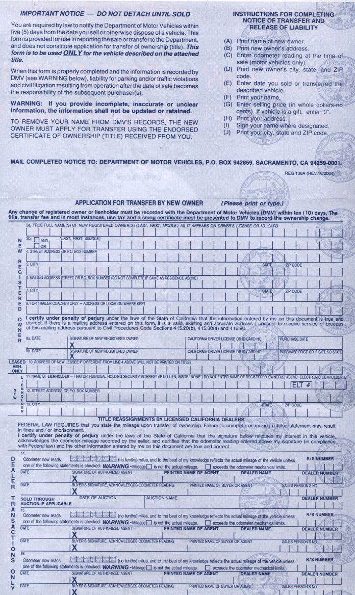 Der DMV behält den Title dann übrigens ein und schickt dem neuen Besitzer binnen zwei Wochen einen neuen zu. Auf diesem sind die Unterschriftenfelder dann wieder leer und der neue Besitzer kann das Auto später wieder nach dem gleichen Verfahren weiterverscherbeln.