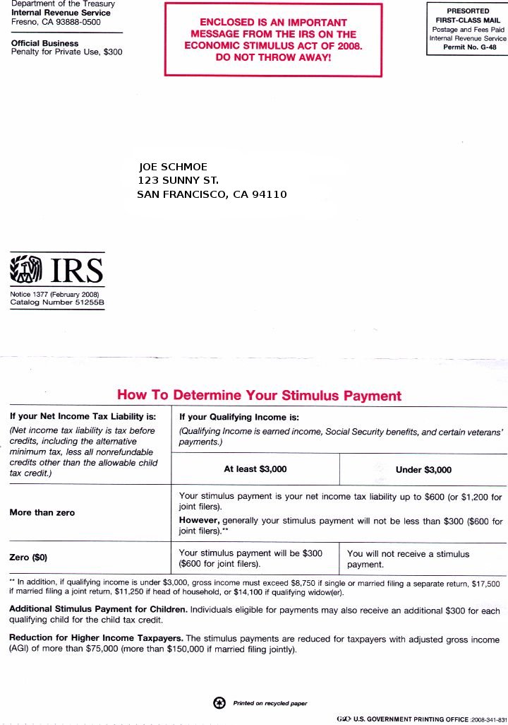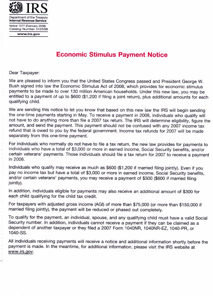 Aber Rettung ist in Sicht. Ab dieser Woche verschickt das Finanzamt auf Anordnung von Präsident Bush und dem amerikanischen Kongress Schecks an die Bürger, damit sie wieder fleißig konsumieren. Jeder, der 2007 eine Steuererklärung abgegeben hat, ein Einkommen von mindestens $3.000 hatte und eine Sozialversicherungsnummer besitzt, erhält von Vater Staat bis zu $600 ($1.200 für Verheiratete mit gemeinsamer Steuererklärung). Für jedes Kind unter 17 werden nochmal $300 drauf gepackt. Besserverdienende müssen sich allerdings mit weniger zufrieden geben. Dass die geschenkten Sümmchen das Ruder rumreißen, bezweifeln allerdings die meisten Wirtschaftsexperten.