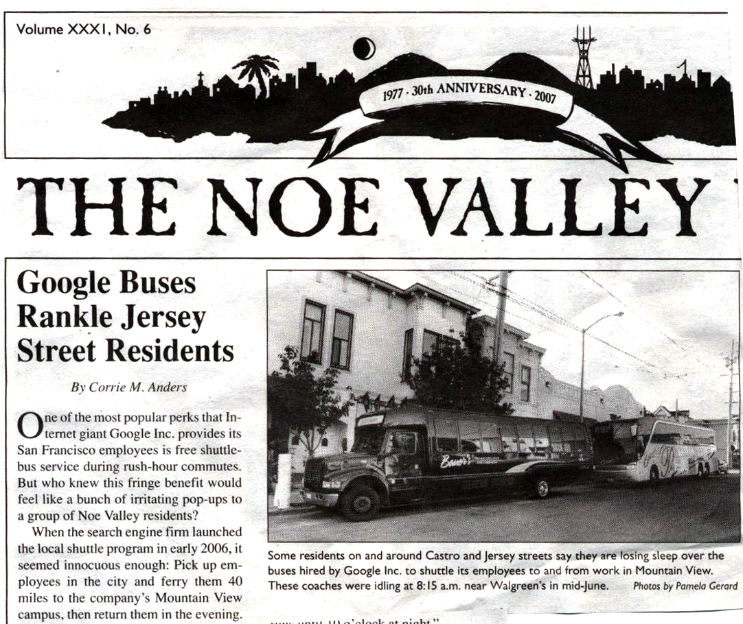 Und wenn die Firma Google ihre Angestellten mit dem Shuttle in San Francisco abholt und diese Busse durch die nachts ruhigen Gassen brummen, wird auch gleich Zeter und Mordio geschrieen. In Abbildung 3 seht ihr die entsprechende Meldung im Stadtteilblatt "Noe Valley Voice". (In der Überschrift steht übrigens das selten verwendete Verb "to rankle", schaut im Wörterbuch nach was es bedeutet.) Unter coolen Leuten gibt es deswegen wieder die Tendenz, ins südamerikanische Viertel Mission oder gar in ziemlich heruntergekommene Gegenden wie Hunters Point (Rundbrief 02/2008) zu ziehen, um den angepassten Möchtegern-Alternativen in unserem Viertel zu entfliehen.