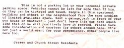 Überreglementierungen dieser Art sprießen übrigens in San Francisco wie Pilze aus dem Boden. Aus der ehemaligen Revoluzzerstadt ist ein Heim für frühvergreiste Enddreißiger geworden, die nichts Besseres zu tun haben, als sich in ihre millionenschweren Häuser zu setzen, ihr Geld zu zählen und Stadtteilinitiativen zu starten, wenn's mal keine Parkplätze gibt. Neulich hatten wir den Perlman fast eine Woche lang auf der Jersey Street in unserem Viertel geparkt, und das darf man wegen einer relativ unbekannten und absurden Vorschrift eigentlich nicht: Die Höchstparkdauer ist 72 Stunden, dann muss man das Auto mindestens einen Straßenblock weit bewegen. Daran hält sich eigentlich niemand, doch prompt hängte uns so ein Sesselfurzer aus der Jersey Street einen Zettel ans Auto und beschuldigte uns mit wüsten Worten (Abbildung 2). Was für ein Idiot!