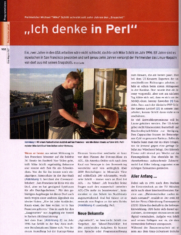 Michael Und noch ein Hinweis in eigener Sache: Zum zehnjährigen Jubiläum der Zeitschriftenkolumne, die ich jeden Monat für das deutsche Linux-Magazin schreibe, hat die Zeitschrift eine Art Home-Story veröffentlicht, die jetzt endlich auch Online verfügbar ist. Mit einigen Fotos wird da unser aufregendes Leben in San Francisco dokumentiert und meine heldenhaften Taten angepriesen. Ist recht gut geworden, finde ich, recht unterhaltsam und sogar alles relativ korrekt. Mein nächstes Ziel ist das Titelbild von "Capital", wenn ich endlich den großen Durchbruch mit einer Startup-Firma schaffe. Ich arbeite daran, aber ich kann nicht hexen!