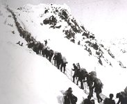 In Skagway und Dyea (gesprochen: "Dei-ii"), zwei Flecken auf der Landkarte ohne richtigen Hafen, entluden sie den Proviant, gingen von Bord und mussten erst einmal zu Fuß einen verschlammten 70 Kilometer langen Gebirgspass überwinden, um zum Lake Bennett zu gelangen, wo es mit selbstgebauten Booten und Flößen weiterging. Im Yukon-Gebiet gab's natürlich nichts zu beißen, also musste der mitgebrachte Proviant für ein Jahr reichen und der wog dementsprechend etwa eine Tonne pro Mann. Viele liefen den Pass bis zu 50 mal, um ihr Gepäck auf die andere Seite zu schaffen, das dauerte bei manchen Leuten bis zu drei Monaten! Der Pass war vollgepfropft mit Karawanen von Männern und gesäumt mit toten Pferden. Die hartherzigen Goldsucher gingen nicht gerade freundlich miteinander um. Ich habe gelesen, dass Männer, die sich kurz am Wegesrand ausruhten, oft stundenlang nicht mehr in die Karawane hineingelassen wurden, die sich Mann-an-Mann den Gebirgspass hochschlängelte. So sind sie, die Amis, das ist heutzutage im Straßenverkehr noch genauso!
