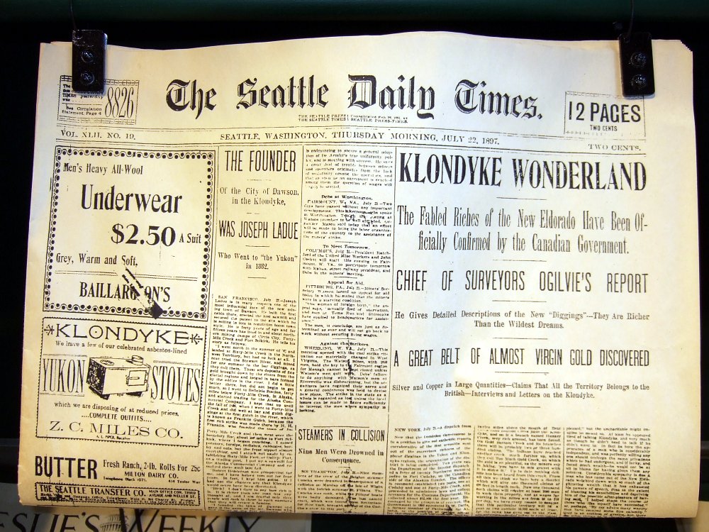 In Seattle waren wir neulich im "Klondike-Museum" und haben uns darüber informiert, wie das anno 1897 ablief. Erst drangen Gerüchte über Goldfunde aus den nördlichen Territorien in die Hafenstädte Amerikas, und da die amerikanische Wirtschaft in den letzten 10 Jahren des 19. Jahrhunderts ziemlich brachlag, machten sich Hunderttausende auf, um in Alaska Gold zu suchen. Sie gaben ihre Jobs als Verkäufer, Fabrikarbeiter oder Bankangestellte auf, machten ihre Habseligkeiten zu Geld, fuhren nach Seattle und kauften dort Proviant für ein Jahr mitsamt Goldgräberausrüstung. Schiffe brachten die sogenannten "Stampeder" (von stampede = trampelnde Büffelherde) dann von Seattle im Nordwesten der USA hoch bis nach Alaska.