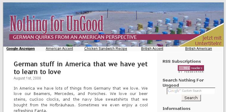 Eine weitere bemerkenswerte Publikation ist Nothingforungood.com, also die bewusst falsche Übersetzung von "Nichts für ungut". Die Schreiber stellen zum Beispiel richtig fest, dass man zwar in Deutschland zu später Stunde problemlos an Alkohol kommt, dass man aber durch die ganze Stadt fahren muss, um eine Notapotheke aufzusuchen, in der man Aspirin kaufen kann, die man in Amerika in jedem Supermarkt bekäme. Oder dass man auf amerikanischen Parties am besten Songs spielt, die die Leute noch nie gehört haben, während es in Deutschland eher ankommt, wenn man Musik spielt, die die Leute in- und auswendig kennen und in betrunkenem Zustand mitsingen können, wie wahr!