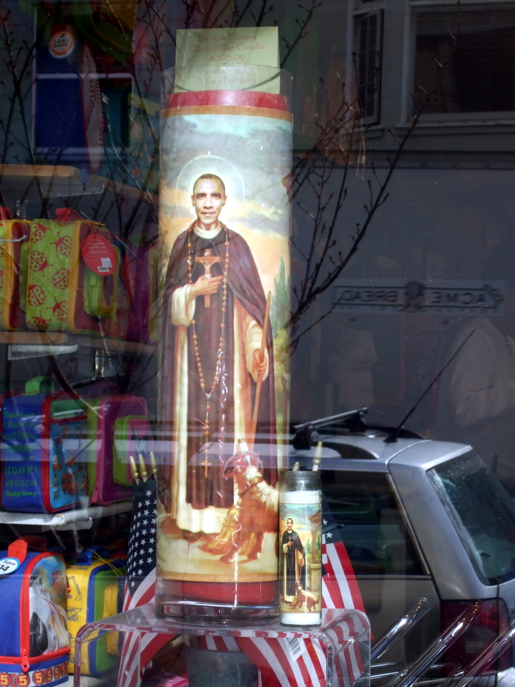 In unserem Viertel "Noe Valley" steht Obama aber weiterhin hoch im Kurs. Kurz vor Weihnachten tauchten sogar Gebetskerzen mit Obama als Heiligem in den Geschäften auf. Der Krims-Krams-Laden "Just for Fun" fing damit an, aber mittlerweile gibt es die Kerzen auch in anderen Geschäften, denn sie verkaufen sich gut. "Just for Fun" platzierte eine Riesenausgabe der Kerze, die schlappe $395 kostet, in ihrem Schaufenster (die kleinere Modelle kosten übrigens nur um die $15). Das erregte wiederum die Aufmerksamkeit des Priesters Tony LaTorre der um die Ecke ansässigen katholischen Gemeinde St. Philip. Er sieht die Obama-Kerze als Beleidigung des katholischen Glaubens und der Heiligenverehrung in der katholischen Kirche. Er rief seine Gemeindemitglieder auf, nicht mehr bei "Just for Fun" zu kaufen und die Geschäftsinhaber wissen zu lassen warum.