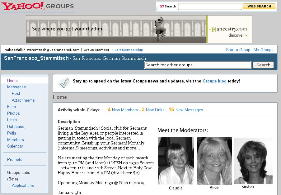 Ein weiteres Kuriosum sind die vom Betreiber ermunterten Kurzvorstellungen der Neuankömmlinge, die sich immer lesen wie "Hallo, also, ich bin der Martin aus Buxtehude und wohne jetzt in Palo Alto. Meine Hobbies sind Schwimmen, Wandern und mal ein gepflegtes Bier trinken. Würde mich freuen, mal Gleichgesinnte zu treffen!". Aber, hey, ich will mich nicht über die Leute lustig machen, die Mailingliste des San Francisco Stammtisch ist gigantisch groß und der Zuwachs ist enorm, ich habe mal irgendwas von 100 im Monat gehört! Irgendwas müssen die Betreiber richtig machen. Und das ist sicher nicht das Webdesign der Homepage, das muss man deutlich sagen, man kommt sich vor wie auf einer Zeitreise ins Jahr 1990!