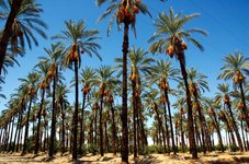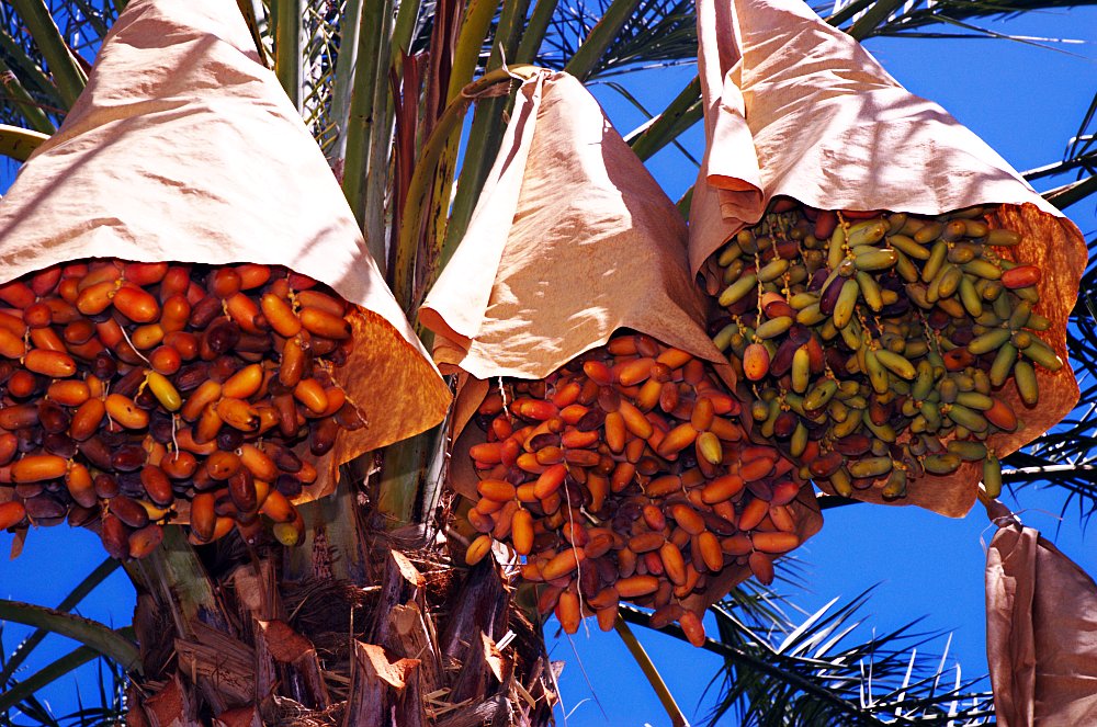 Aber wo wachsen Datteln eigentlich? Als wir neulich in Palm Springs waren, sahen wir vom Highway aus tatsächlich Palmen mit dicken Datteltrauben, die zur Stabilisierung in Papier eingewickelt waren. Neugierig hielten wir an und begutachteten die mächtigen Gewächse. Ich würde schätzen, dass an einem Zweig sicher 20 Kilo Datteln hingen!