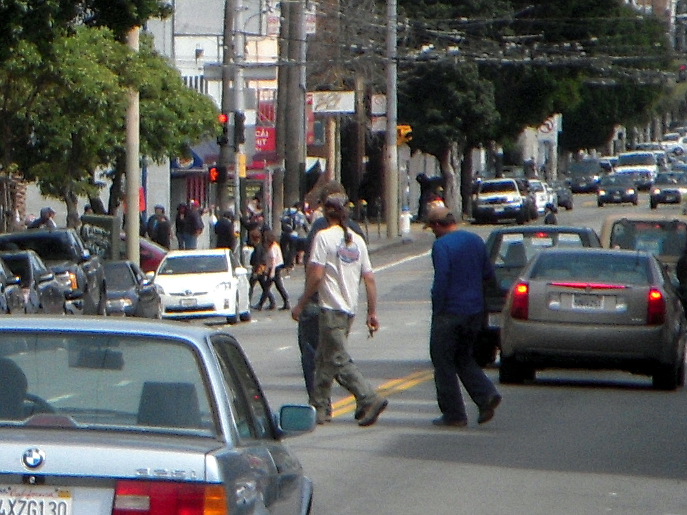 Auch als Fußgänger muss man aufpassen. So darf man die Straße nicht einfach irgendwo zwischen zwei aufeinanderfolgenden Ampelkreuzungen überqueren, sondern muss eine Ampel nehmen. Alles andere nennt der Gesetzgeber "Jaywalking" und kassiert dafür $25. Mit den im letzten Rundbrief erklärten Strafzuschlägen beläuft sich der Bußbescheid dann auf $108! Zur Herkunft des Wortes: Ein "Jay" ist ein bauernhafter Tölpel, also jemand, der sich in der Stadt nicht stadtgemäß benimmt. Allerdings schreitet die Ordnungsmacht bei derartigen Vergehen nur dann ein, wenn ihr steinlangweilig ist oder sie einen Grund sucht, der betreffenden Person eins auszuwischen. In San Francisco kommt das aber praktisch nie vor, ich habe sogar einmal, mit dem Fahrrad fahrend, ein Polizeiauto übersehen und bin routinemäßig durch ein Stoppschild gefahren -- keine Reaktion.