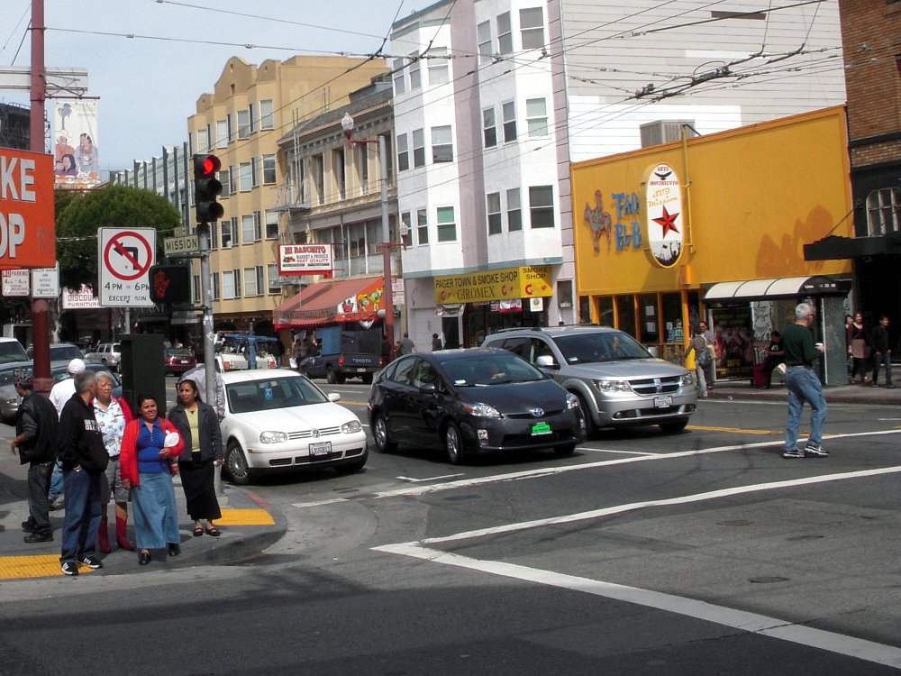 Stellenweise steht auf den Verbotsschildern auch noch eine Uhrzeit, und manchmal sogar eine Ausnahmeregelung. So darf man auf der Mission-Street im mexikanischen Stadteil, wie in Abbildung 5 zeigt, zwischen 16 und 18 Uhr nicht links abbiegen. Am Sonntag ist Linksabbiegen allerdings erlaubt, was Englischsprecher dem darunter stehenden "Except Sun" entnehmen können. Im mexikanischen Stadtteil sprechen aber viele nur Spanisch, was dazu führt, dass kaum jemand das verkehrstechnische Schlupfloch am späten Sonntagnachmittag nutzt.