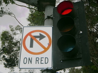 In Deutschland darf man an extra ausgewiesenen Ampeln bei Rot rechts abbiegen, wenn dies gefahrlos möglich ist. In Amerika gilt dies generell, es sei denn, ein Schild verbietet es explizit wie in Abbildung 4. Geheimtipp: Gehen zwei Spuren nach rechts ab, darf man auch auf der linkeren Spur bei Rot abbiegen. Und, was viele nicht wissen: Bei Rot darf man auch nach links abbiegen, falls man am linken Rand einer Einbahnstraße steht und nach links in eine weitere Einbahnstraße einfährt. Ich habe es in San Francisco mit seinen vielen Einbahnstraßen schon oft eiskalt verifiziert, teilweise während auf der Nachbarspur Polizeiautos standen -- kein Problem, falls man schön artig vorher kurz stoppt!