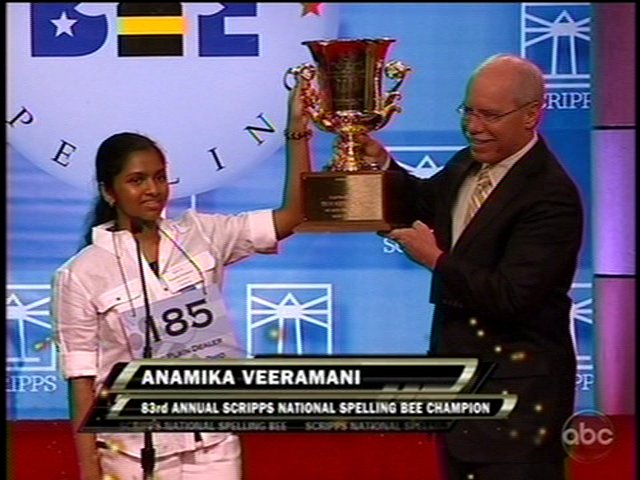 Dieses Jahr gewann die 14-jährige Anamika Veeramani aus dem Bundesstaat Cleveland. Das letzte Wort: "Stromuhr". Das Wort stammt aus dem Deutschen und bezeichnet ein 1867 entworfenes medizinisches Gerät, das sogenannte Kapillarthermometer, mit dem der Arzt die Stärke des Blutflusses in Arterien und Venen misst.