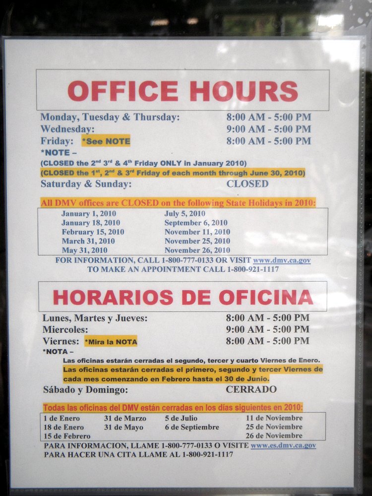 Das bestätigen die beinahe durchgehend katastrophale Bewertungen auf Google-Maps, von "pathetic" (erbärmlich) bis "disgraceful" (schändlich) ist alles dabei. Das scheint die Verantwortlichen in Sacramento jedoch nicht zu interessieren, dabei stöhnen die Leute schon seit mehr als zehn Jahren über den Lotterbetrieb. Durch das akute Finanzproblem hat sich die Lage ja noch verschärft und in ganz Kalifornien sperrt der DMV seine Türen nun an drei von vier Freitagen im Monat zur Kostendämpfung überhaupt nicht mehr auf. Früher war er sogar samstags offen!