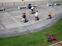 Im Sommer herrschen in San Diego bis in die tiefe Nacht hinein Temperaturen von fast 30 Grad. Wie in Städten mit angenehmem Klima üblich, siedeln sich auch in San Diego haufenweise Penner an, die dann dort am Strand herumlungern. Die Ordnungsbehörde sieht das natürlich nicht gern, denn zuviele Penner schrecken Touristen ab. Deshalb fahren Uniformierte mit Elektroautos den ganzen Tag Patrouille und scheuchen die Penner auf, wenn etwa zwei Stunden abgelaufen sind. In San Francisco malen die Politessen einen Kreidestrich auf die Reifen parkenden Fahrzeuge, um in Zonen ohne Parkuhr festzustellen, wer gerade erst angekommen ist und wer schon die Höchstparkdauer von zwei Stunden überschritten hat. Vielleicht nutzen die Penneraufscheucher ja ein ähnliches Verfahren, wir sind aber leider nicht dahinter gekommen.