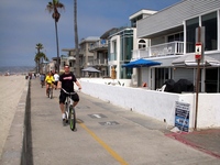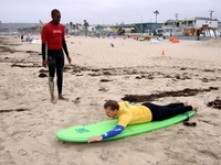 Michael Über das Labor-Day-Wochenende düsten wir runter nach San Diego, um die dort gut fünf Grad wärmere Wassertemperatur im Ozean zu testen (statt 13 Grad schon annehmbare 18). In einem Surfshop liehen wir uns Hippie-Fahrräder aus, um zwei Stunden gemächlich an der Strandpromenade entlangzuradeln. Nach der Tour gaben wir die Räder zurück und entdeckten, dass der Laden auch Surfkurse anbot, für $80 konnte man anderthalb Stunden mit einem erfahrenen Surfer die Kunst des Wellenreitens erlernen, Wet-Suit (Neopren-Anzug) und Surfboard inklusive.