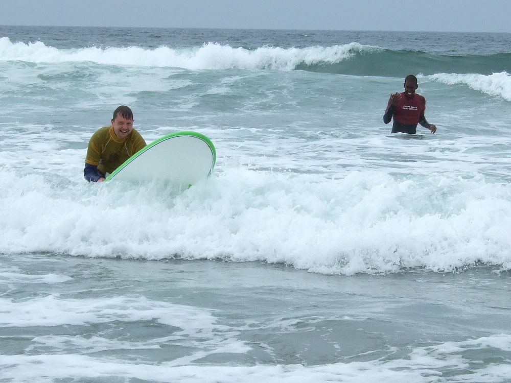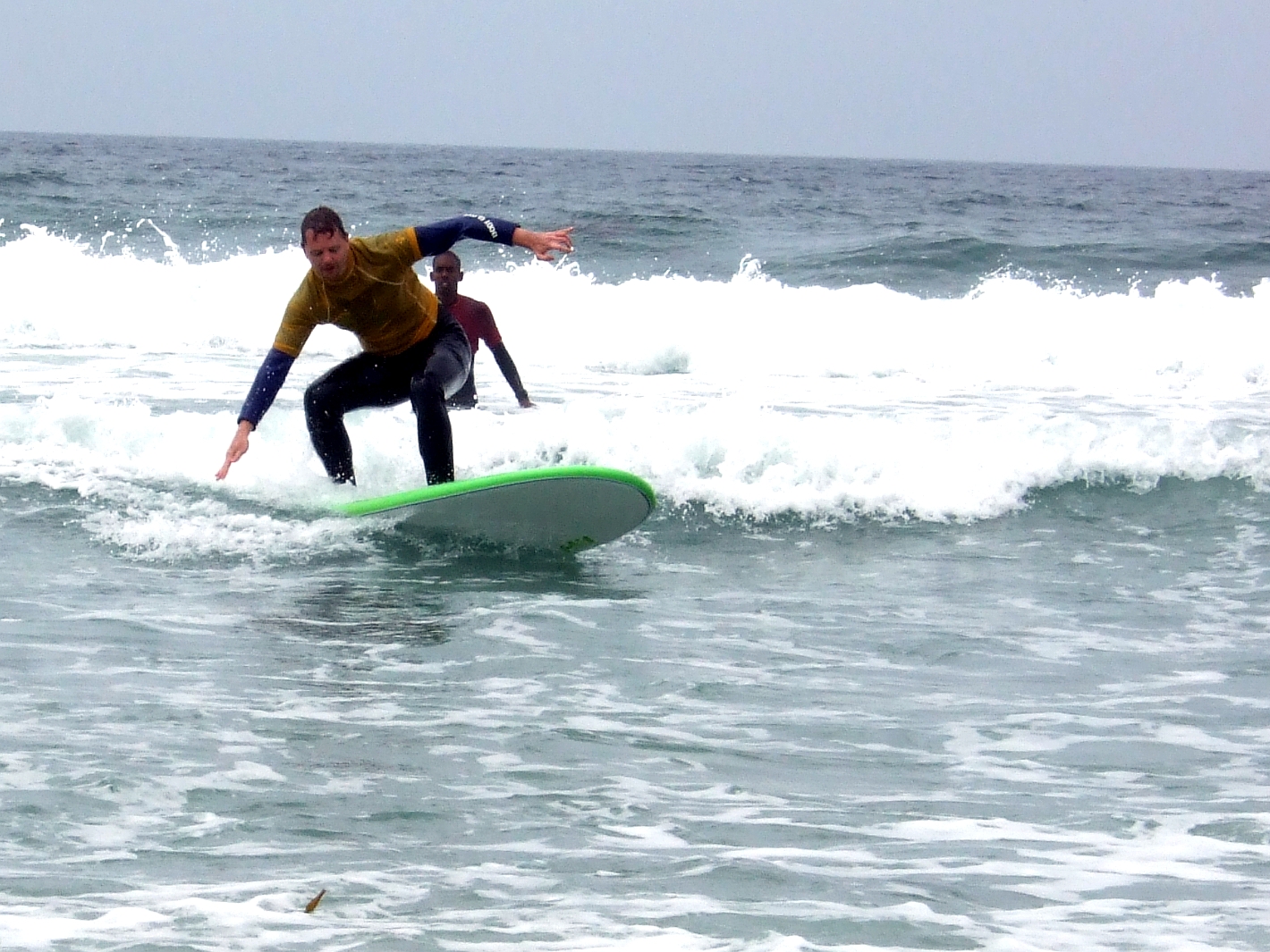 Angelika war etwas skeptisch, aber ich meldete mich gleich für den nächsten Tag um 11 Uhr an. Mein Surflehrer stammte aus Barbados, einer Karibik-Insel bei Puerto Rico und redete genau wie Ali G. in der gleichnamigen Fernsehserie ein jamaikanisches Englisch zum Totlachen. Nach einer theoretischen Einführung in die Historie des Surfens (Hawaiianer habens erfunden) und Boardkunde (langes Brett ist leicht anzupaddeln und stabil, kurzes nur für Könner) ging's raus an den Strand zur Trockenübung: Der Länge nach kerzengerade auf das Board legen, die Arme abwechselnd und nahe am Board durchs imaginäre Wasser ziehen, dann rechts und links am vorderen seitlichen Boardrand festhalten und mit einem Satz in die Hocke springen. Dreimal probiert, dann ging's ab ins Wasser.