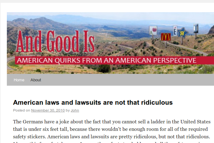 "Nothing for Ungood" gehörte dabei eindeutig zu unseren Favoriten. Was haben wir schon gelacht über die messerscharfen Beobachtungen des Autors John Madison. Nun ist er aber wieder zurück in die USA gezogen und berichtet in einem neuen Blog andgoodis.com über amerikanische Sitten und Gebräuche, die er nun wegen seines langen Deutschlandaufenthalts aus einem anderen Blickwinkel sieht. Falls es euch über die Feiertage langweilig wird, unbedingt lesen.