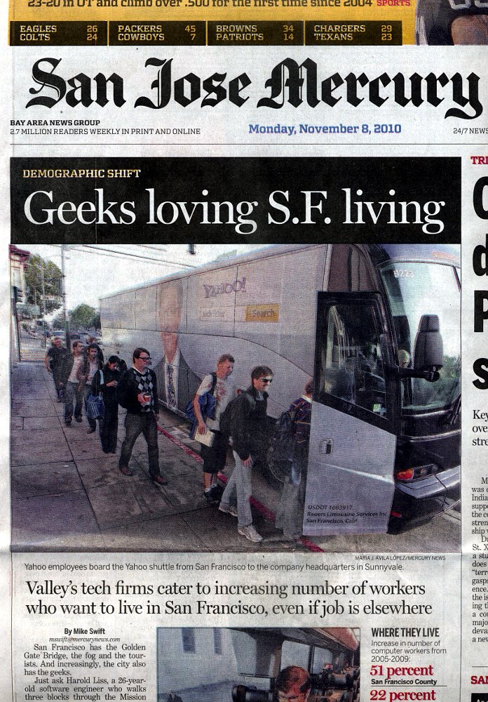Michael Neulich in der Frühe teilten mir Gewährsleute mit, dass ich auf der Titelseite der Silicon-Valley-Zeitung "San Jose Mercury News" gelandet wäre. Wie sich herausstellte, allerdings nicht, weil ich endlich eine Startup-Klitsche für ein paar Milliarden an einen Konzern verkloppt hätte, sondern im Rahmen eines Artikels über die Pendler von San Francisco ins Silicon-Valley und die privaten Shuttlebusse großer Softwarefirmen, die diesen Service kostenlos anbieten. Freilich ein alter Hut für treue Rundbriefleser, die dies schon seit 2007 wissen (Rundbrief 04/2007).
