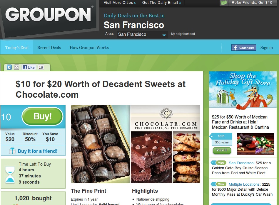 Örtlich spezialisierte Coupon-Websites erscheinen zur Zeit so lukrativ, dass Yahoo neulich über zwei Milliarden Dollar und Google später angeblich drei Milliarden Dollar für Groupon boten! Für eine kleine Rabattklitsche wie Groupon ist das freilich ein absurder Betrag, doch wir befinden uns anscheinend schon wieder in der nächsten Internetblase, in der die Analysten den Wert von Quatschfirmen ermitteln, indem sie deren Jahresgewinn aufs nächste Jahrzehnt hochrechnen. Manche lernen's nie.