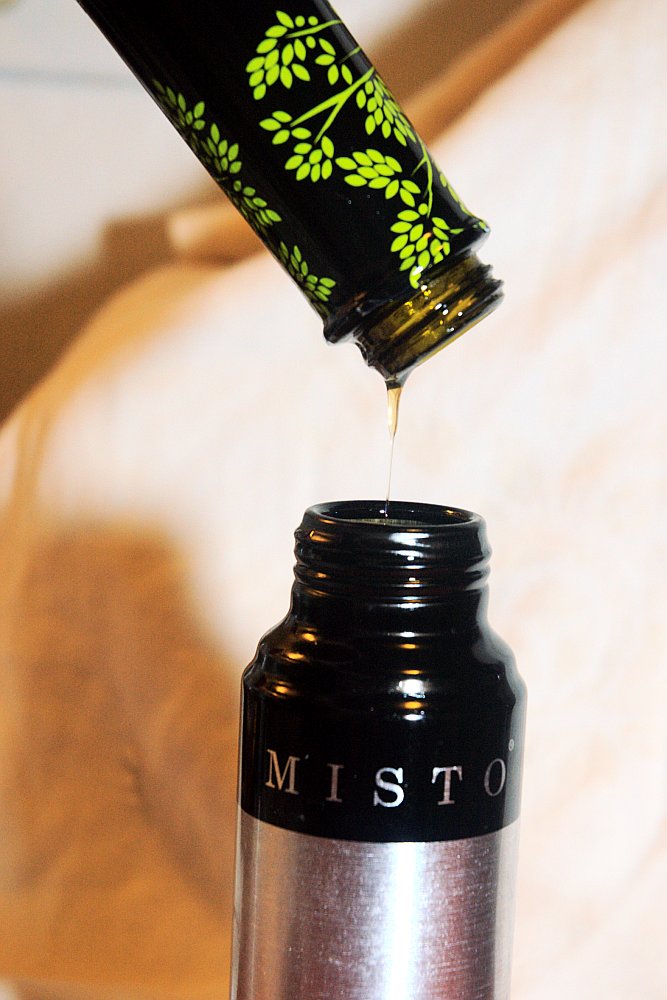 Michael Ob an den Salat, in die Pfanne oder auf Grillgut: Olivenöl verleiht dem Essen eine besondere Note. Wichtig ist aber, es gleichmäßig und dünn aufzutragen, schließlich mag später niemand ölige Kalorienbomben verzehren. Die Lösung fand ich neulich im Laden Bed-Bath-And-Beyond: Eine Spraydose namens "Misto", in die man Öl hineinfüllt, dann mit Hilfe eines Aufsatzes von Hand Druckluft hineinpumpt und anschließend per Knopfdruck einen schönen Nebel produziert, der das Olivenöl hauchdünn auf Speisen aufträgt.