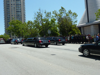 Wie im Rundbrief 02/2006 schon einmal berichtet, liegen alle Friedhöfe San Franciscos vor den Toren der Stadt. So mussten die Särge von der Innenstadt nach Colma (etwa 20 Kilometer südlich) zum Friedhof "Holy Cross" einschließlich aller Trauergäste transportiert werden. Die Prozession bestand aus einer scheinbar endlosen Autokolonne. Die Verantwortlichen der Stadtverwaltung sperrten kurzer Hand diverse Straßen in San Francisco und legten einige Buslinien am Tag der Trauerfeier um. Auch der Freeway 280, eine der Hauptautobahnen im Süden San Franciscos, wurde für mehrere Stunden geschlossen, und zwar an einem Freitag zur Hauptberufsverkehrszeit. Wer weiß, wie es sich schon an normalen Wochentagen zu Stoßzeiten staut, kann sich die Auswirkungen ungefähr ausmalen. Aber die Menschen standen nicht nur geduldig im Stau sondern viele säumten die Straßen, um den Feuerwehrleuten die letzte Ehre zu erweisen. Die Stadt hatte zwei Helden verloren.