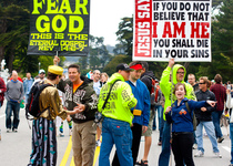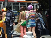 Ihr seht schon, der Bay-to-Breakers lässt sich mit keinem Lauf der Welt vergleichen. Leider wohnen in San Francisco mittlerweile ein paar Spielverderber, die seit einigen Jahren versuchen, den Lauf in ein Nullachtfünfzehn-Ereignis für Herrn und Frau Saubermann umzufunktionieren. Wie immer bei großen Menschenaufläufen schlagen einige wenige über die Stränge und trinken zuviel Alkohol oder benehmen sich daneben. Ein besonderers Ärgernis für viele Anwohner, die in Häusern an der Strecke wohnen, ist, dass betrunkene Teilnehmer manchmal die Vorgärten als Urinal mißbrauchen. Nun kann ich verstehen, dass das nervig ist, auf der anderen Seite findet der Bay-to-Breakers nur einmal im Jahr statt und da sollte man vielleicht auch einmal ein Auge zudrücken oder verreisen, wenn man ein Partymuffel ist. Seit 2009 bemühen sich die Organisatoren, strengere Vorschriften durchzudrücken, mit mehr oder weniger Erfolg. Alkohol während des Laufs mitzuführen und zu trinken ist offiziell seit zwei Jahren verboten, bloß hielt sich bis dato keiner daran. Zunächst führte der Veranstalter eine Gebühr für die sogenannten "Floats" ein, kleine geschmückte Handwagen, auf der sich in der Regel ein Fass Bier befand. Dieses Jahr verbot man sie gleich ganz und konfiszierte Alkohol generell. Der Sponsor hatte dafür extra neben der Polizei private Sicherheitskräfte eingestellt. Auch standen Ausnüchterumgszelte an der Strecke. Außerdem fing das Rennen nicht wie sonst immer um 8 Uhr morgens an, sondern schon um 7 Uhr. Die zugrundeliegende Strategie war wohl, dass Partyliebhaber nicht gerne früh aufstehen. Es ging dieses Jahr tatsächlich gesitteter zu, doch auf Kosten des besonderen Flairs der Veranstaltung.