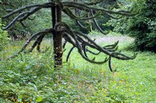 Wir lernten, dass schon seit anno tuck und toback Menschen ihr Glück in diesen einsamen und unzugänglichen, von der Welt abgeschnittenen Gegenden gesucht haben. Bernt Ronning, ein norwegischer Einwanderer, baute sich zum Beispiel 1910 mitten in den Regenwald kurz vor Cape Scott an der nie fertig gestellten alten Wagenroute nach St. Josefs Bay eine Hütte in den Wald und lebte dort bis zu seinem Tod in den frühen 60ern Jahren vom Fischfang und Fallenstellen. Auch hatte er die verückte Idee, Samen und Setzlinge aus aller Welt zu bestellen und einen Teil des Regenwalds zu roden, um seine Pflanzen und Blumen gedeihen zu lassen. So blühten in seinem Garten mitten im Regenwald artfremde Pflanzen wie Rhododendron, Osterglocken, Heckenrosen aber auch Affenbäume. Nach dem Tod von Bernt Ronning nahm der Regenwald den Garten schnell wieder in Besitz, bis viele Jahre später die heutigen Besitzer Ron und Julia Moe es sich zur Aufgabe machten, den Garten wieder aufblühen zu lassen. Laut Reiseführer muss Bernt Ronning auch derart exotische Pflanzen gezogen haben, dass es Botanikern immer noch nicht gelungen ist, alle zu bestimmen.