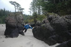 Ein besonderers Zuckerl ist der Cape Scott Provincial Park mit der wunderschönen einsamen St. Josefs Bucht. Dort hinzugelangen ist schon ein Abenteuer für sich. Zunächst fuhren wir zwei Stunden (ein Weg!!!) über unbefestigte Straßen, die den Holzlastwagen als Transportwege dienen. Dann ging es weiter zu Fuß durch einen Regenwald, bis wir an einem nebelverhangenen einsamen Strand ankamen. Ich hätte mich nicht gewundert, wenn Dinosaurier um die Ecke gebogen wären.