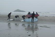 In Tofino wimmelt es außerdem im Juli von Surfanfängern, gegen die euer werter Erzähler sogar noch ganz sportlich aussieht. Die Wassertemperatur ist etwas angenehmer als in San Francisco, wo einem ohne dicken Neopren-Wetsuit vor Kälte sofort das Herz stehen bleibt. Das Wetter war nieselig, aber sehr mild, die Wellen eher mäßig, aber im Oktober soll dort ein ordentlicher "Swell" herrschen (Surferjargon für dicke, regelmäßige, gut surfbare Wellen).