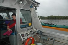 Einmal sauste ein schweres Motorboot durch die Bucht und löste eine etwa 1m hohe, behäbige, von mir so genannte "Tsunami" aus, die sich langsam dem Kajak näherte und wir paddelten schnell, um das Boot in die gleiche Richtung zu drehen. Zum Glück hatte uns der Kajakführer das vorher gesagt, sonst hätten wir wohl ein kaltes Bad genommen. Kommt angeblich etwa zweimal im Jahr vor, sagte der Kajakführer, und er muss die Leute dann immer rausziehen, denn als Tourist kann man noch keine Eskimo-Rolle.