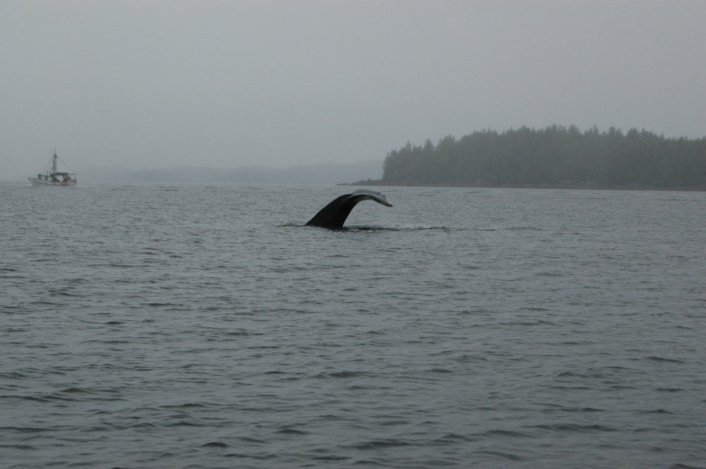 Bei einer Tour ein paar Wochen voher war ein Buckelwal einem Kajak zu nahe gekommen und die Kajak-Touristen waren beinahe vor Schreck gekentert und ins Wasser geplumpst. Auf der Heimfahrt im Zubringerboot sahen wir dann doch noch einige Wale beim Herumplanschen, einen sogenannten "Humpback Wale" (Buckelwal), und einen Grauwal, die wir routiniert fotografierten.